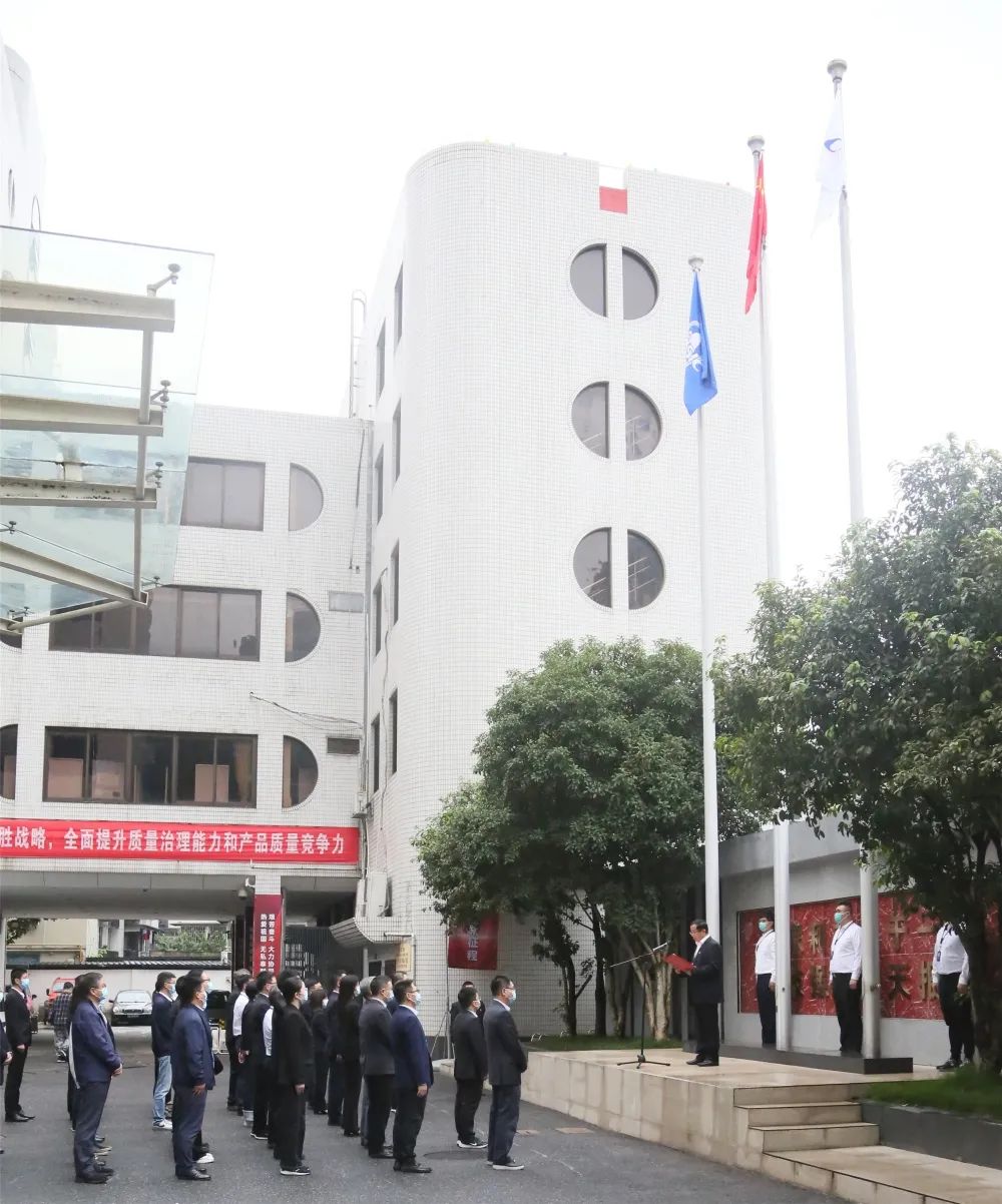 伴隨著雄壯的國歌,鮮艷的五星紅旗冉冉升起,隨著激昂的航天科工之歌,集團(tuán)公司司旗飄揚(yáng)空中。參加升旗儀式的全體干部職工莊嚴(yán)肅立,行注目禮。