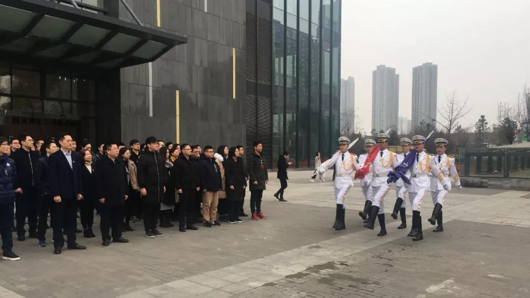 通信研究院全體干部職工,成都航天、304所四川分公司、航天電器四川分公司、華燦工場等入駐企業及雙創平臺有關人員參加了升旗儀式。上午九時,升旗準時開始,旗手步伐整齊、氣勢恢宏地護送國旗、司旗迎面而來;伴隨著《義勇軍進行曲》雄壯有力的旋律,五星紅旗和航天科工司旗冉冉升起,全體人員行注目禮,愛國熱情和航天豪情在大家心中熊熊燃起,現場莊嚴而肅穆。