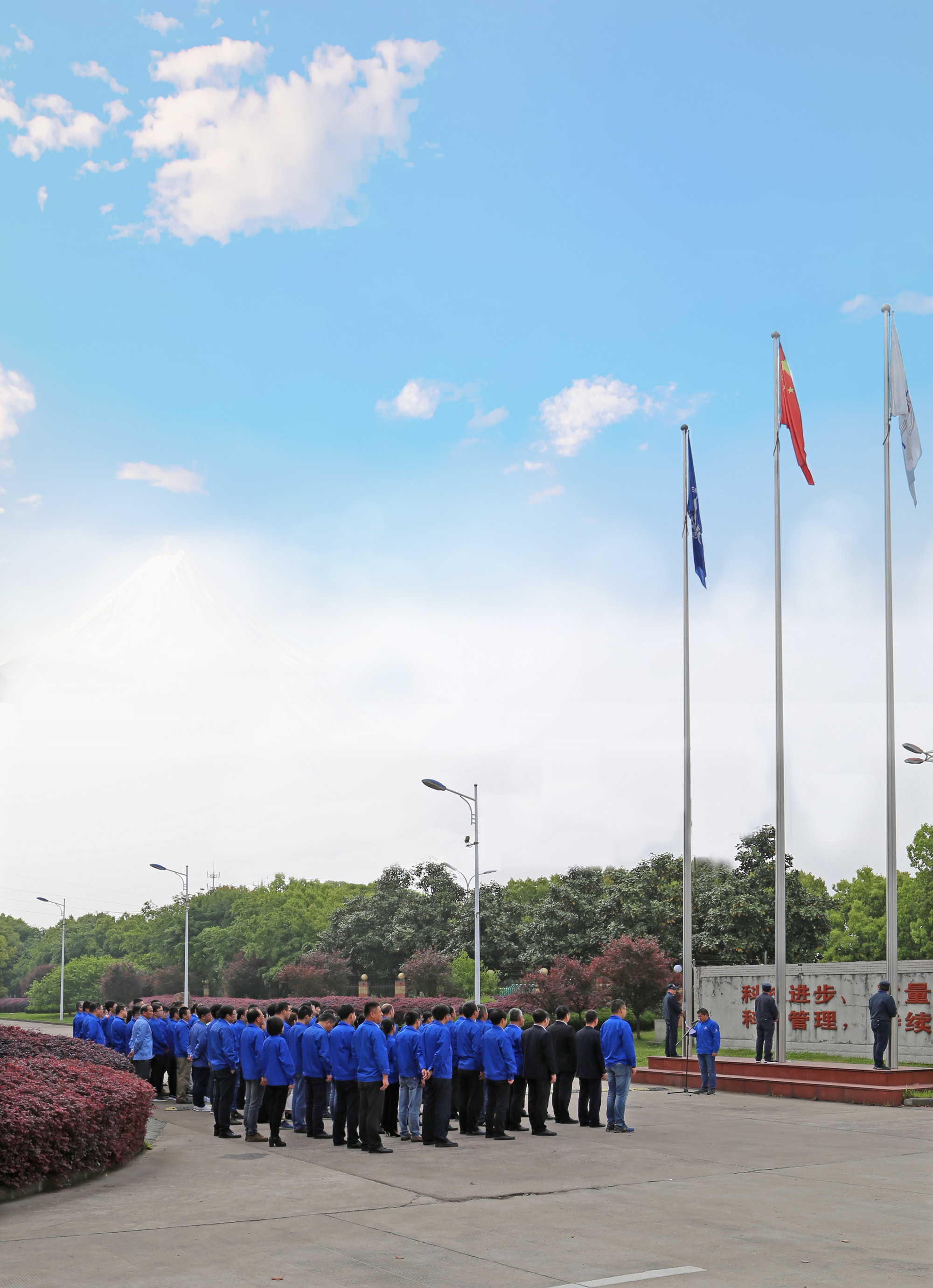 江蘇捷誠領(lǐng)導(dǎo)班子、各車間部室負(fù)責(zé)人、各黨支部書記、工會和團委代表、技術(shù)中心全體人員參加升旗儀式。當(dāng)雄壯有力的《義勇軍進行曲》響徹整個廠區(qū),全體人員行注目禮,全場彌漫著一種莊嚴(yán)肅穆的氣息,鮮艷的五星紅旗冉冉升起,激發(fā)了全體干部職工不斷向上的斗志,點燃了大家強烈的愛國熱情。升旗儀式上,公司黨委號召全廠職工把愛國之志轉(zhuǎn)化為報效祖國的實際行動,為航天事業(yè)發(fā)展而奮斗。